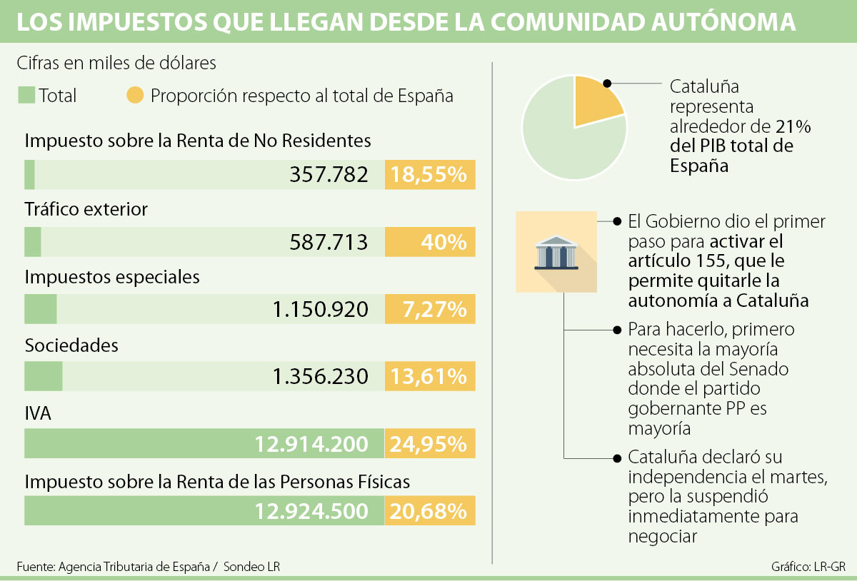 Según las cifras a agosto de la Agencia Tributaria, el total de los ingresos tributarios fue de US$147.824 millones, de los cuales US$30.026 millones salen registrados desde Cataluña. Si se mira solo el impuesto a las sociedades, que se paga directamente a la Hacienda española, 13,61% se recauda gracias a la comunidad autónoma. Al cambiar de sede fiscal, no solo las compañías se aseguran que solo tengan que pagar este tributo una vez sino que se convertiría en un ingreso que pierde Cataluña una vez haga realidad su independencia.