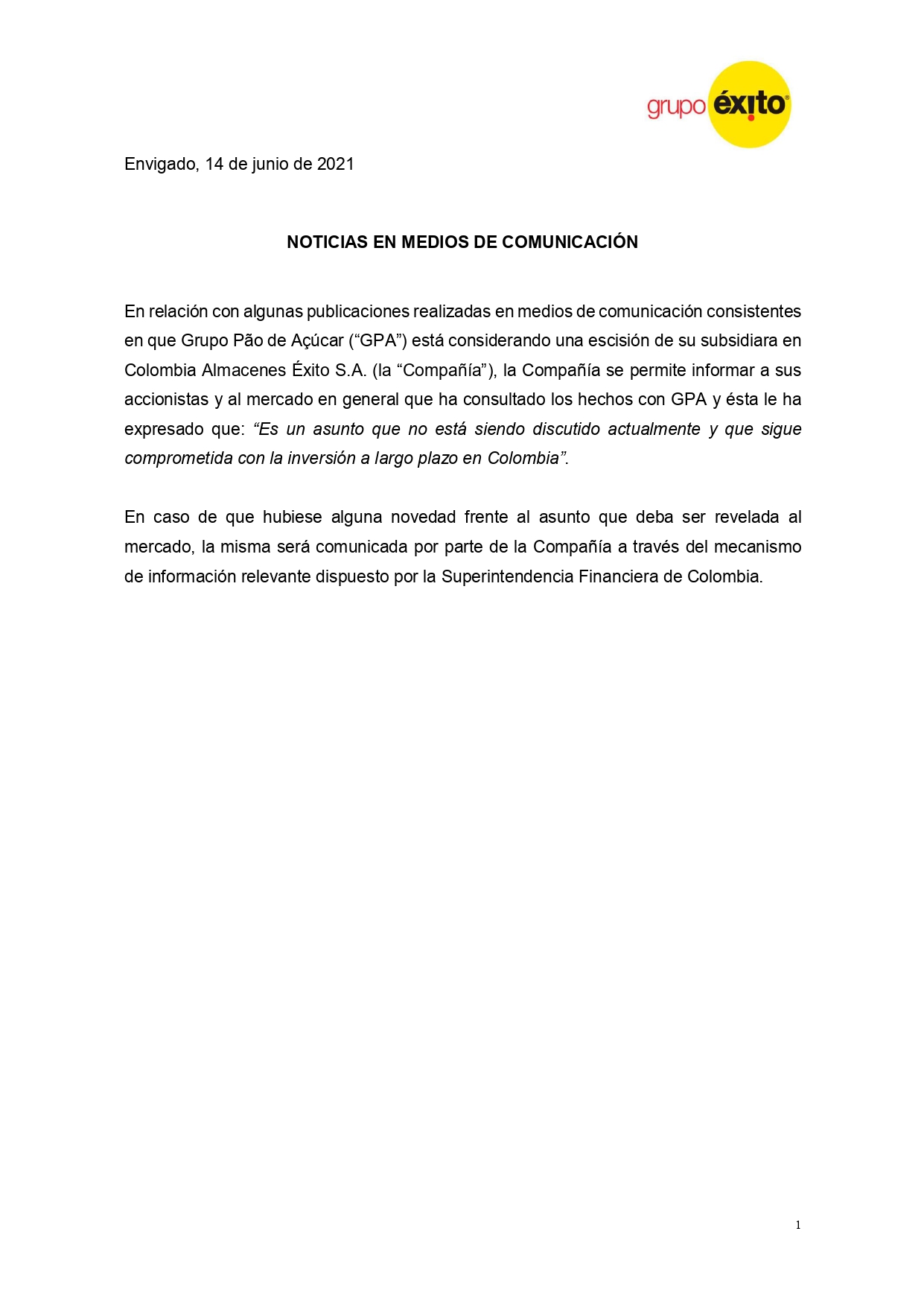 "En relación con algunas publicaciones realizadas en medios de comunicación consistentes en que Grupo Pão de Açúcar (“GPA”) está considerando una escisión de su subsidiara en Colombia Almacenes Éxito S.A. (la “Compañía”), la Compañía se permite informar a sus accionistas y al mercado en general que ha consultado los hechos con GPA y ésta le ha expresado que: “Es un asunto que no está siendo discutido actualmente y que sigue comprometida con la inversión a largo plazo en Colombia”.