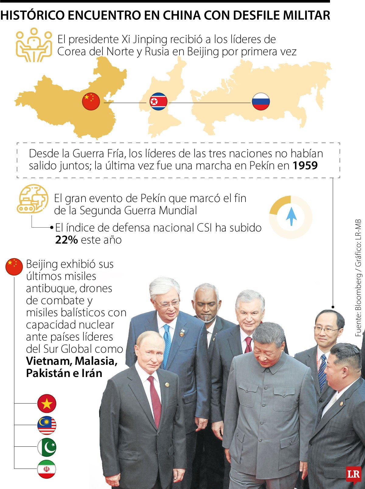 El comandante en jefe de China estuvo flanqueado por Vladimir Putin y Kim Jong Un al acercarse a la Puerta de Tiananmén de Pekín durante un gran desfile militar el miércoles, en su primera aparición con ambos. Desde la Guerra Fría, los líderes de las tres naciones no habían salido juntos; la última vez fue una marcha en Pekín en 1959, cuando Mao Zedong recibió a Kim Il Sung y Nikita Khrushchev.