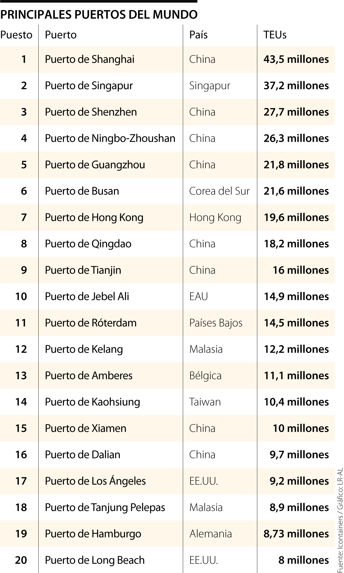 China tiene el mayor puerto del mundo, el de Shanghai, que gestiona más de 43,5 millones de TEU, acrónimo de Twenty Equivalent Units, es decir, la capacidad de carga que tiene un contenedor estándar de 20 pies.