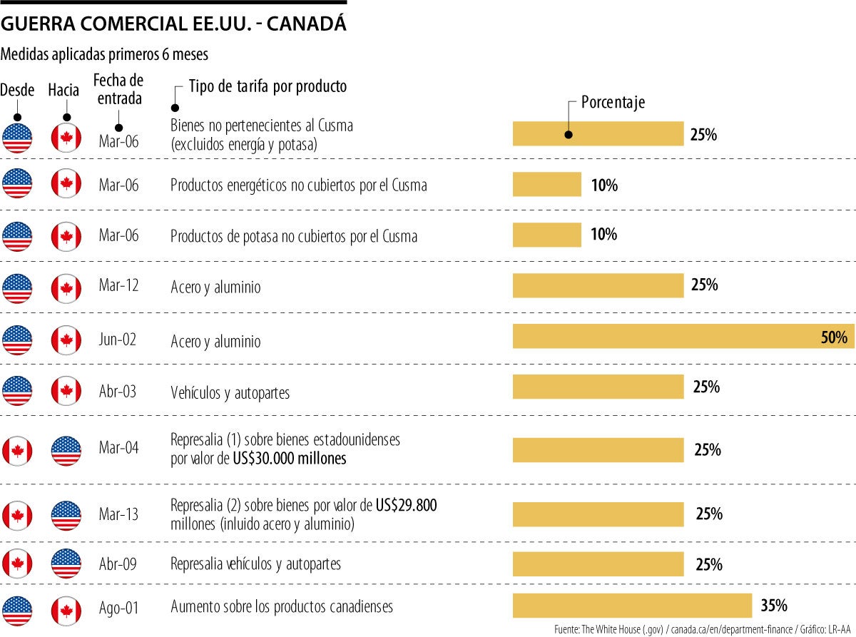 El primer golpe llegó el 4 de marzo, cuando Estados Unidos impuso un arancel de 25% a la mayoría de las exportaciones canadienses y de 10% a su energía, incluido el petróleo, con la amenaza de subirlos a 35%. Ottawa reaccionó con simetría decretando aranceles de 25% sobre US$30.000 millones en productos estadounidenses. Lista que se amplió a otros US$29.8000 millones, incluyendo acero, aluminio y bienes industriales.
