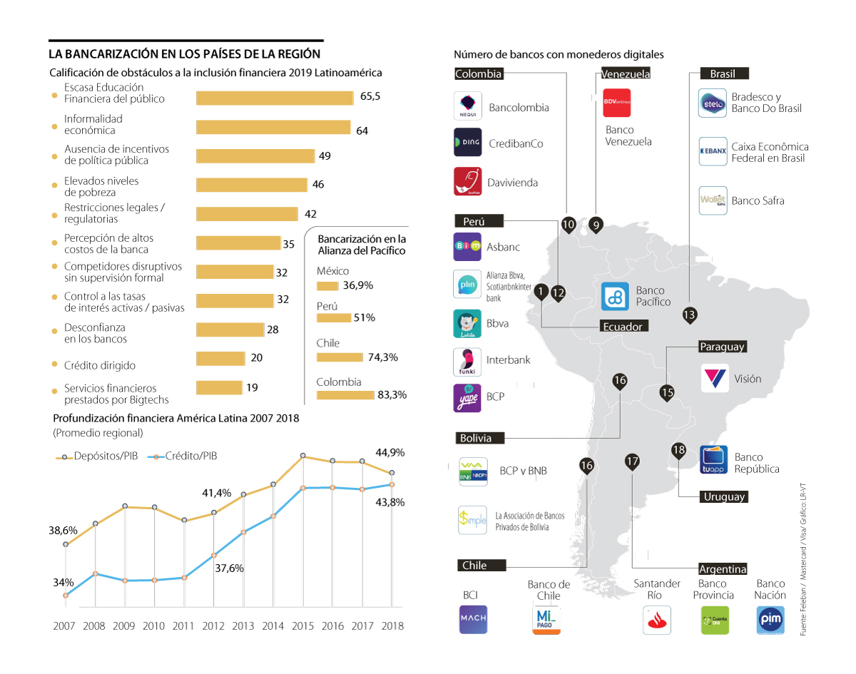 A esto se le suma que de acuerdo con datos de Mastercard, América Latina actualmente registra una penetración de 55% en cuentas bancarias, de 19% en tarjetas de crédito y de más de 70% en smartphones. Según Federico Martínez, gerente general de Mastercard Colombia, “la inclusión financiera, conocida como bancarización, es en esencia un proceso de inclusión social con profundos efectos en la reducción de la pobreza en América Latina. Desde el ecosistema de proveedores de tecnología financiera, se han venido realizando estrategias enfocadas en la simplificación de la adaptación para el uso de los canales bancarios como las tarjetas sin contacto y las billeteras virtuales que incentiven la adquisición de productos bancarios en toda la región durante la pandemia del covid-19”.