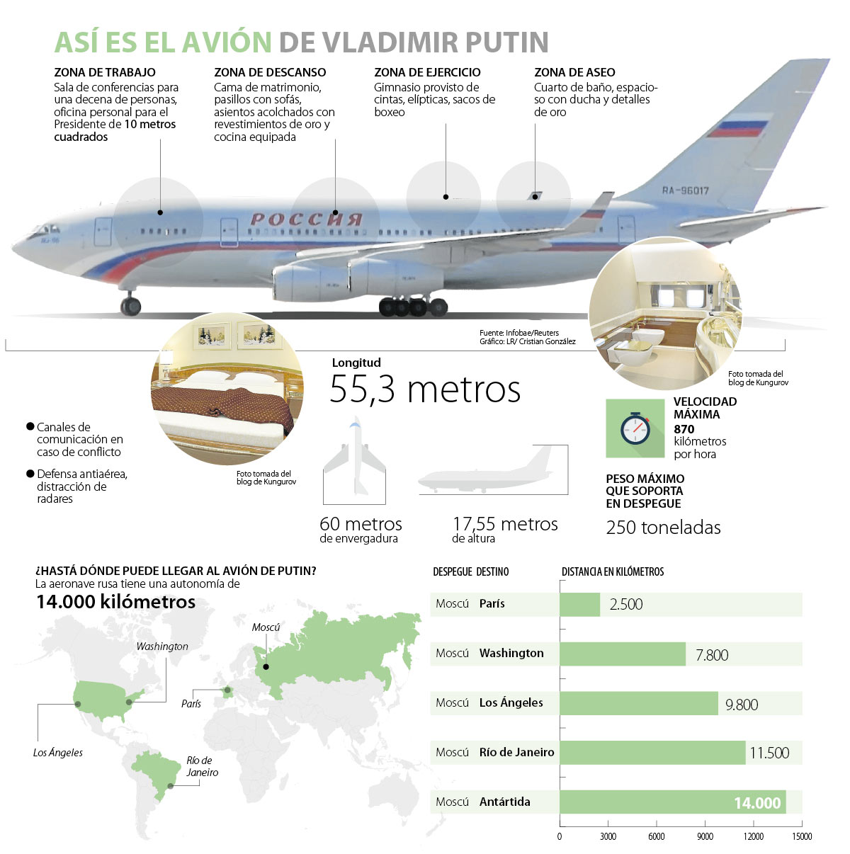 En la zona de trabajo, tiene una sala de conferencias a la que pueden asistir una decena de personas y una oficina personal para el presidente de 10 metros cuadrados. En detalle, el medio de transporte de Putin tiene una altura de 17,55 metros y alcanza una velocidad máxima de 870 kilómetros por hora. Llega a soportar 250 toneladas al momento del despegue y, con las modificaciones que se le han hecho, está valorado en más de US$500 millones. Para garantizar la seguridad del presidente cuando realiza sus viajes, el avión viene equipado con defensa antiaérea, distracción de radares y canales de comunicación especiales en caso de presentarse un conflicto.