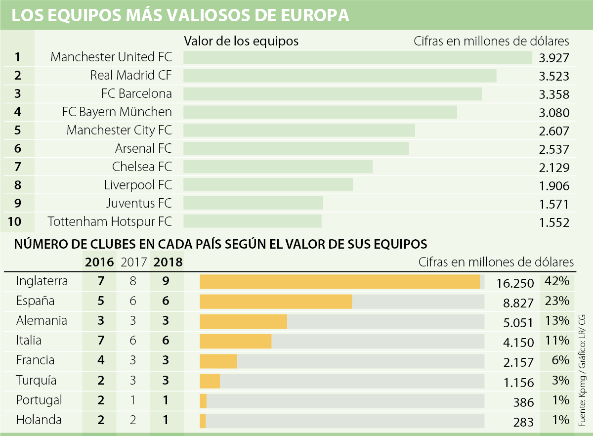 Desafortunado en el campo, pero imbatible en los balances. Pese a su errática trayectoria sobre el terreno de juego, el Manchester United se consolida como el club más valioso del mundo por segundo año consecutivo con un valor estimado de US$3.927millones, por delante de Real Madrid (US$3.523millones) y Barcelona (US$3.358 millones), según el informe The European Elite 2018 elaborado por Kpmg.