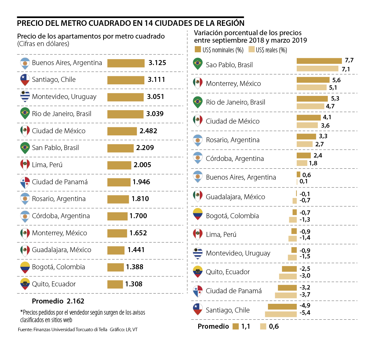 De acuerdo con las cifras del informe, Buenos Aires fue la ciudad que presentó el precio del metro cuadrado más alto, con un valor promedio de US$3.125, seguido por Santiago de Chile, con un costo de US$3.111; Montevideo, con US$3.051; y Río de Janeiro, cuya media se calculó en US$3.039.