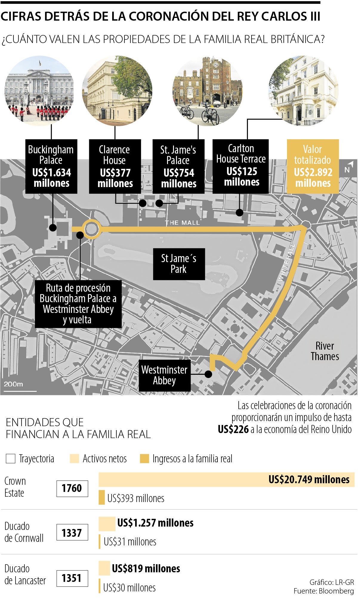 La ruta pasará por propiedades clave asociadas con la familia real que tienen un valor de mercado total de más de 2.300 millones de libras esterlinas (US$2.900 millones). Unos cientos de metros más adelante, la procesión girará hacia la derecha alrededor de Trafalgar Square. Si estira el cuello, el rey puede ver la oficina Art-Deco cerca del Hotel Savoy de cinco estrellas que también apoya su feudo real a través del Ducado de Lancaster.