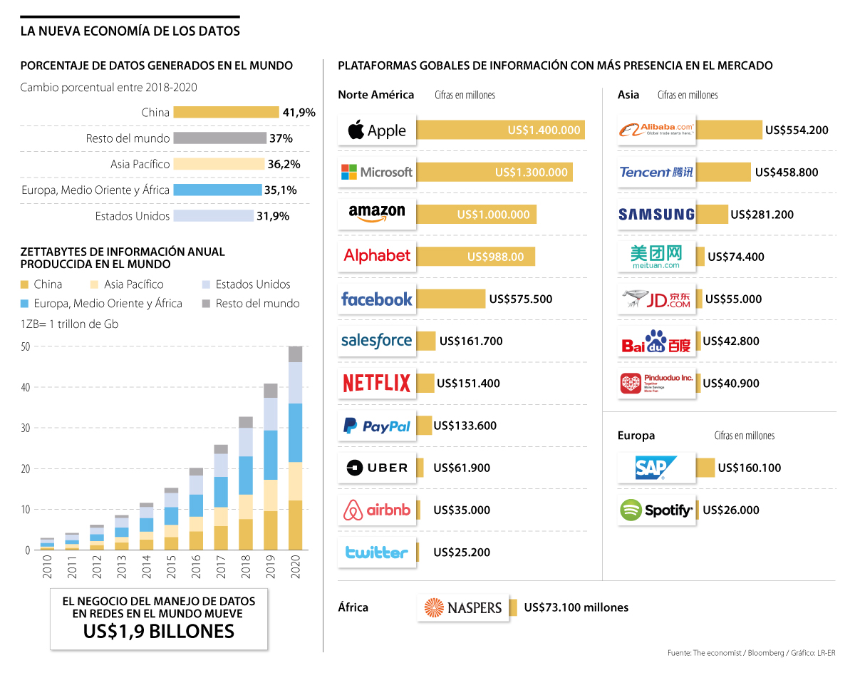 Allí, se ha puesto sobre la mesa la discusión sobre a quién le pertenecen los datos de los usuarios y por qué alguien se lucra con la información personal. De acuerdo con la información recopilada por Bloomberg, el mercado de los datos mueve alrededor de US$1,9 billones, de los cuales US$1,4 billones son de Alphabet y Facebook, producto de la explotación de los datos personales que ejercen las compañías multinacionales y que convierten a la información en el negocio más lucrativo y grande del mundo.