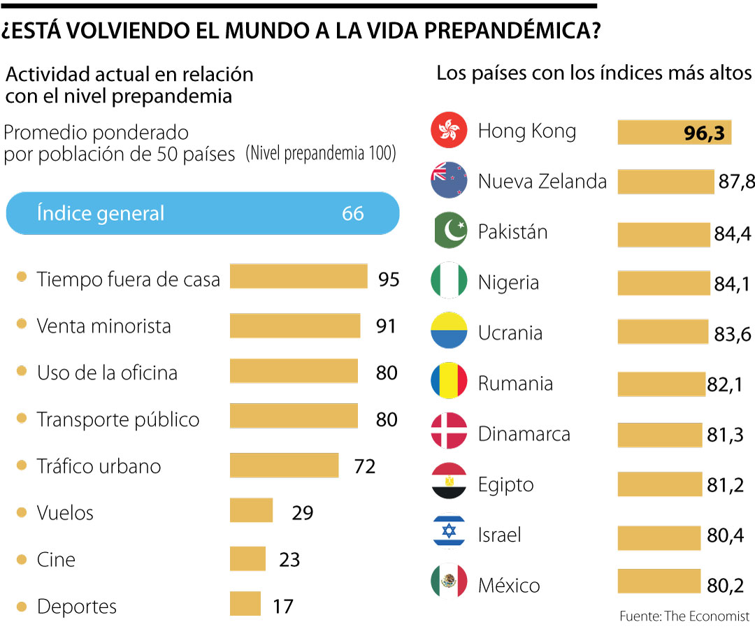 Con esa pregunta en mente, el medio inglés, The Economist, realizó un índice de normalidad, en el que buscaba evaluar qué tanto ha cambiado el comportamiento de la humanidad y qué tareas prepandémicas se han retomado con más fuerza.