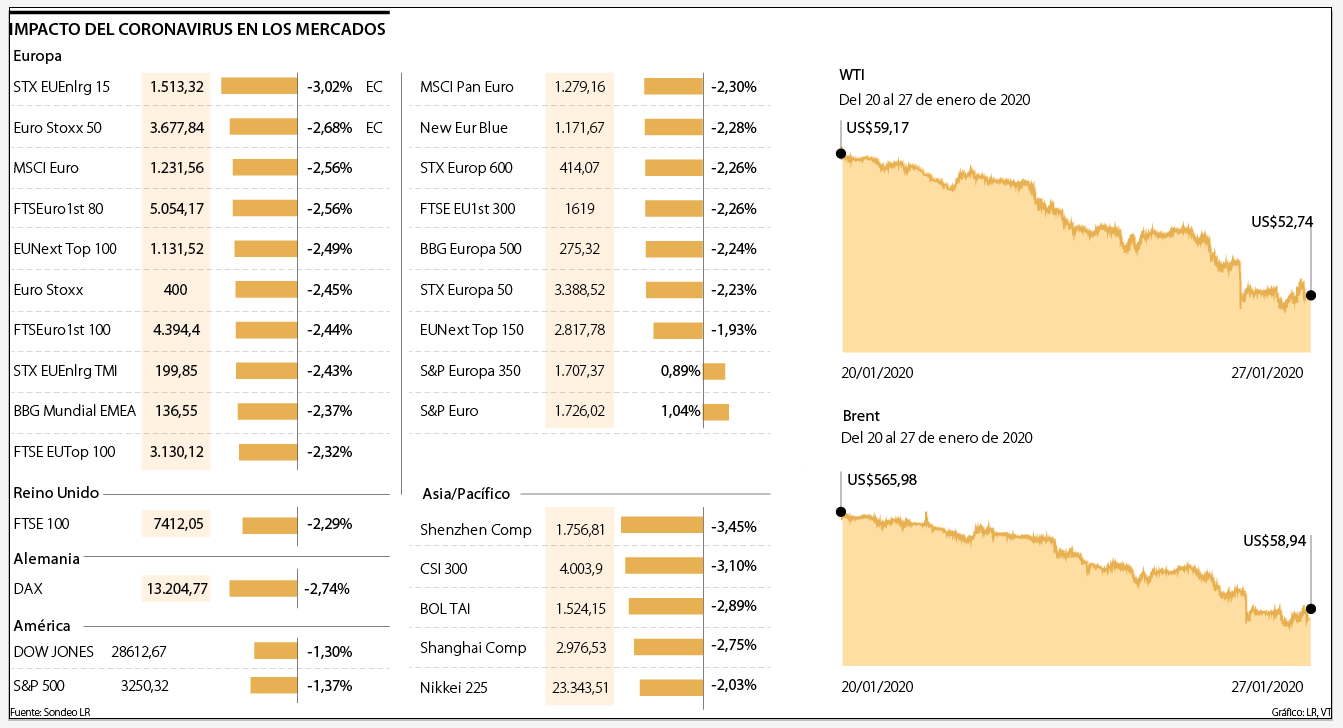 El cierre en rojo de las principales bolsas del mundo y commodities podría agudizarse en los próximos días ya que “los expertos sanitarios ponen en duda la capacidad de China de contener la epidemia y analistas como los de RBC destacan que el ritmo de transmisión del virus es mucho más rápido que el de la gripe aviar en 2003”, informó el diario Expansión.