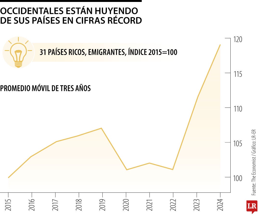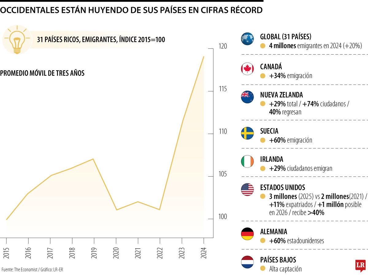 Un análisis de The Economist puso cifras a una tendencia que venía creciendo sin mucho ruido. La revista estimó que cerca de 4 millones de personas salieron de 31 países desarrollados en 2024. Es un aumento de 20% frente a antes de la pandemia y se trata de personas que se van por periodos largos o de forma definitiva.