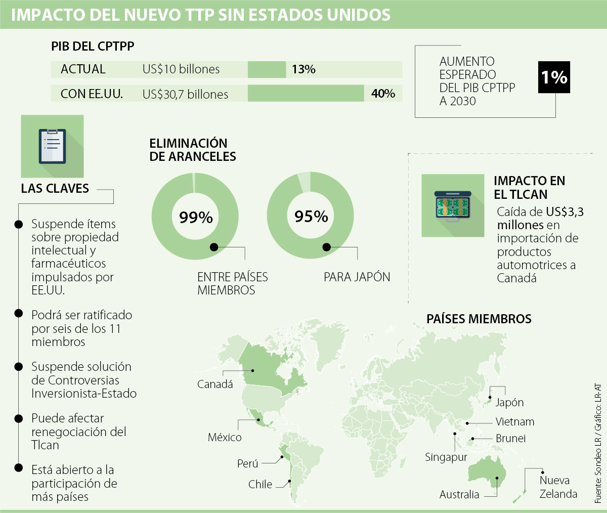 Se tiene previsto que el Cptpp sea firmado el 8 de marzo en Chile y entre en vigor 60 días después de la fecha en la que al menos seis miembros lo avalen. Los 11 países miembros hasta el momento son Australia, Brunei, Canadá, Chile, Japón, Malasia, México, Nueva Zelanda, Perú, Singapur y Vietnam, los cuales representan 13% del PIB mundial.