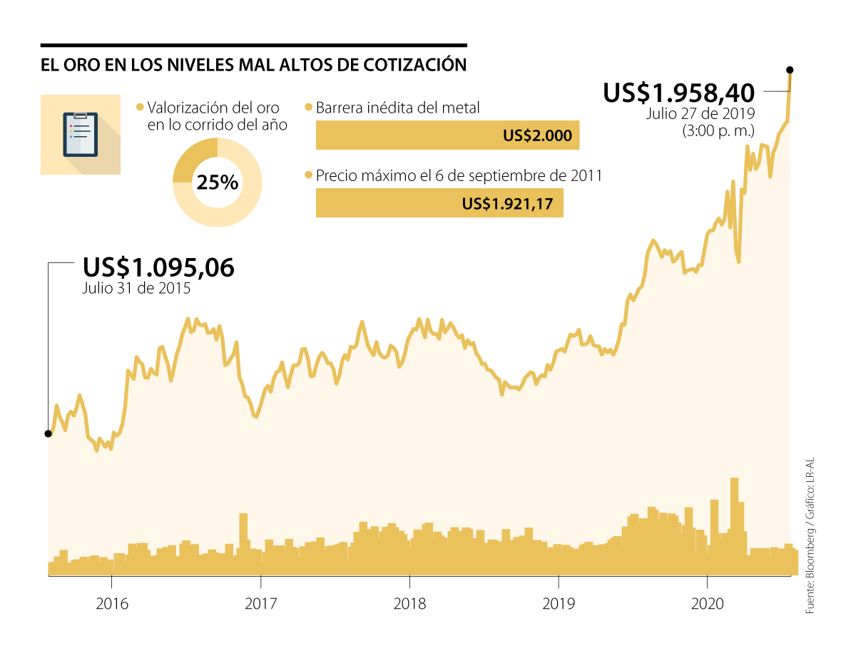 Las primera señales de un ascenso récord del oro empezaron a llegar a mediados de 2019, cuando la Fed señaló su disposición a reducir las tasas de interés ya que la incertidumbre, principalmente por el impacto de las batallas comerciales de Estados Unidos, nubló su perspectiva. El repunte se aceleró a principios de 2020 a medida que aumentaron las tensiones geopolíticas y el coronavirus frenó el crecimiento en todo el mundo, llevando a los gobiernos y los bancos centrales a inyectar grandes cantidades de estímulo y hundiendo las tasas de interés reales aún más en territorio negativo.