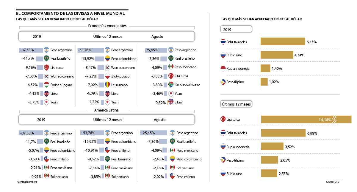 Si habláramos de perdedores y ganadores, al que le ha ido peor este año es el peso argentino. En los últimos 12 meses (agosto 2018-agosto 2019) se ha devaluado 53,76% frente al dólar, y si se hace un corte de cómo le ha ido en lo corrido del año (enero-agosto 2019), la situación no mejora, pues la pérdida ha sido de 37,53% y solo en agosto la devaluación ya asciende a 25,45%, según cifras de Bloomberg.
