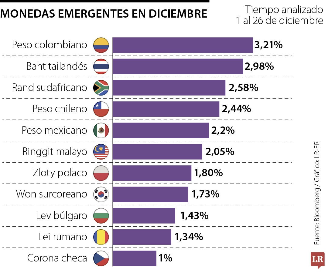 Según datos de Bloomberg, desde el primero hasta el 26 de diciembre, el peso colombiano tuvo una apreciación de 3,2%, seguida del baht tailandés con 2,98% y el rand sudafricano con 2,58%.