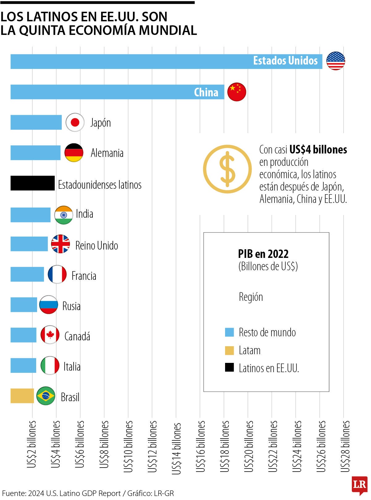 Un ranking de Latinometrics reveló que los latinoamericanos en Estados Unidos representan una producción económica anual de hasta US$4 billones, cifras que solo están por detrás del PIB de Japón, Alemania, China y EE.UU. en cifras generales. “Supera a todos los demás países a pesar de su total de tan solo 65 millones de personas”, se lee en el informe.