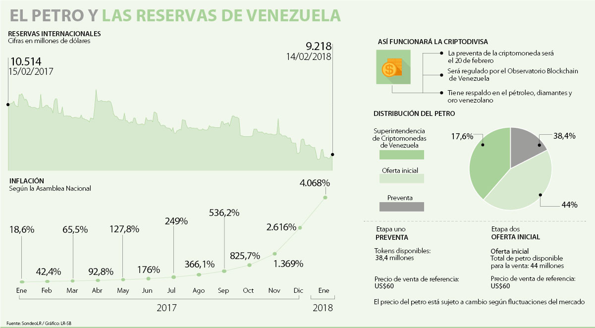 Desde hoy a las 8:30 a.m., hora venezolana, se inició la preventa del petro, el criptoactivo venezolano con el que el gobierno de Nicolás Maduro pretende hacerle quite a la falta de divisas internacionales. La preventa se realizó con 38,4 millones de tokens disponibles cada uno a US$60, según el Libro Blanco publicado hace unas semanas. Es decir, algo equivalente a US$2.304 millones, lo mismo que 25% de las reservas internacionales que hoy tiene el país.