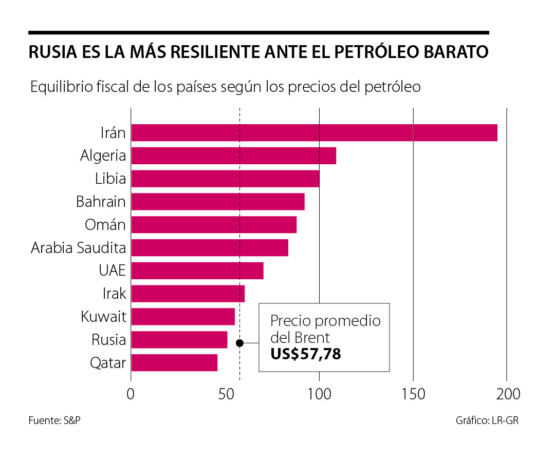 Y efectivamente sobre este último punto, Sorokin tendría el balón en su cancha, ya que este país es más resiliente a un petróleo barato. Según datos del FMI y S&P Global Ratings, que analizaron el punto de equilibrio fiscal (US$/barril), Rusia necesitaría un precio cercano a US$50 para proteger sus finanzas, mientras que Arabia Saudita está en más de US$80 (ver gráfico).