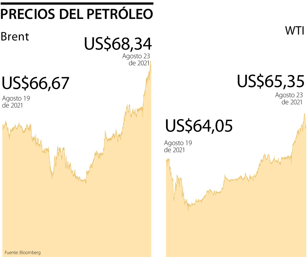 West Texas Intermediate para entrega en octubre ganó US$3.03 a US$65.35 el barril a las 10:25 am en Nueva York, el Brent para la liquidación de octubre subió US$3,16 dólares a US$68,34 dólares el barril.