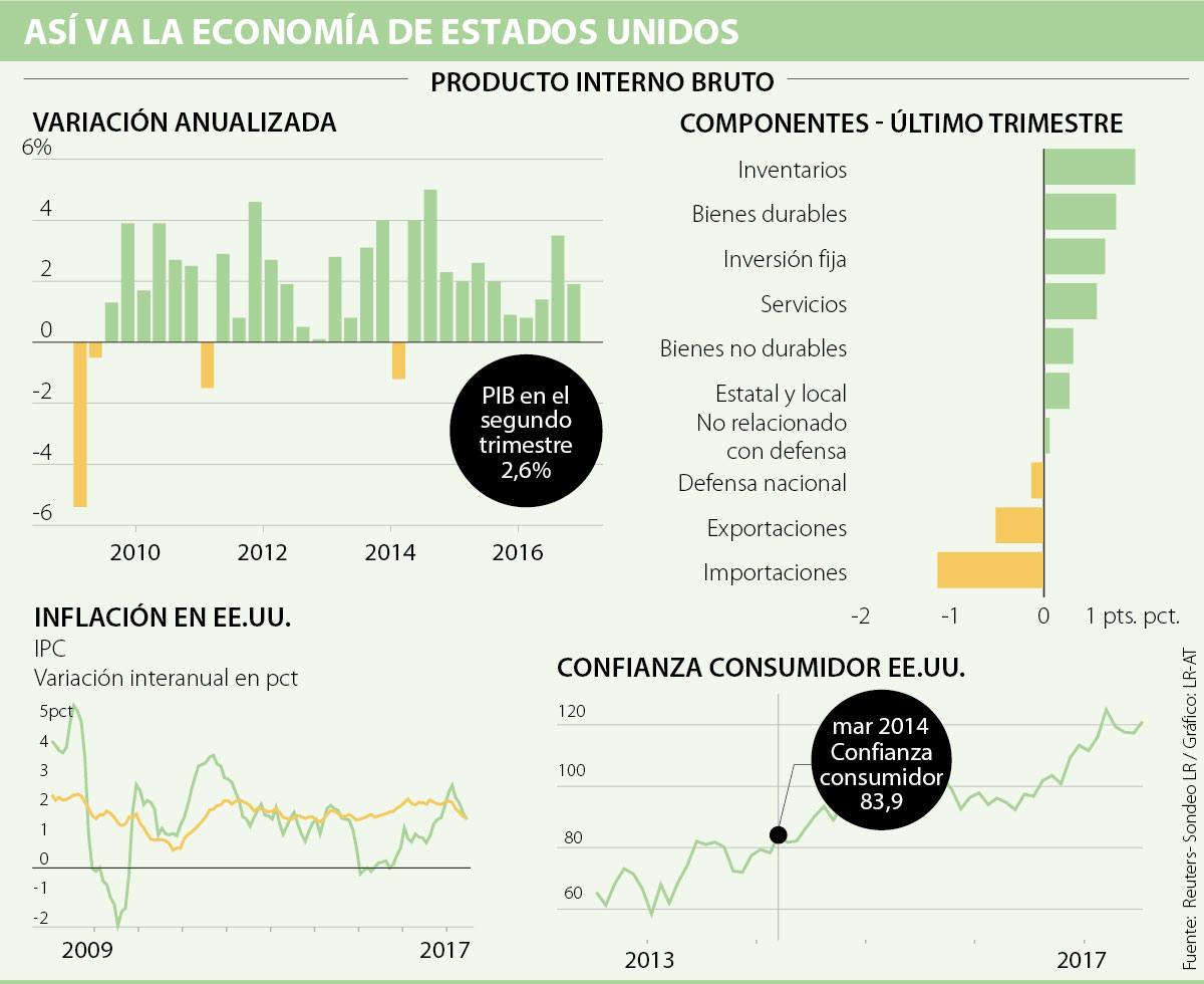 El PIB estadounidense acumuló un aumento de 2,6% en el segundo trimestre, en línea con lo que esperaba el mercado. Sin embargo, según el New York Times, tras este comportamiento, los analistas no prevén que la economía vaya más allá de 2,5% en 2017.