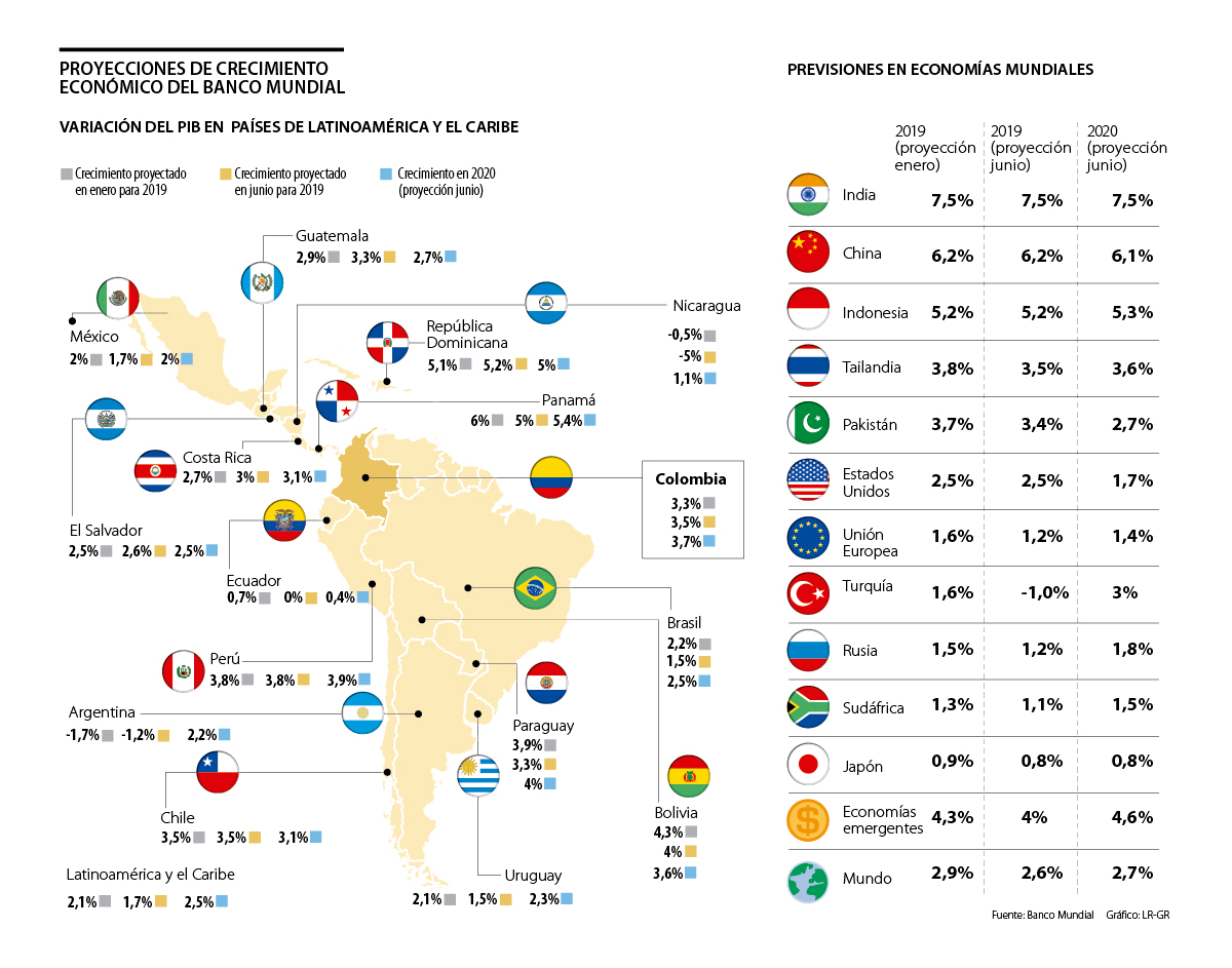 Con esto, el país, que tuvo un aumento de 0,2 puntos porcentuales en la proyección frente a lo pronosticado en enero, será la quinta nación con el mejor desempeño económico en la región durante este año. La proyección del Banco Mundial es igual a la que había expresado el FMI en enero y abril.