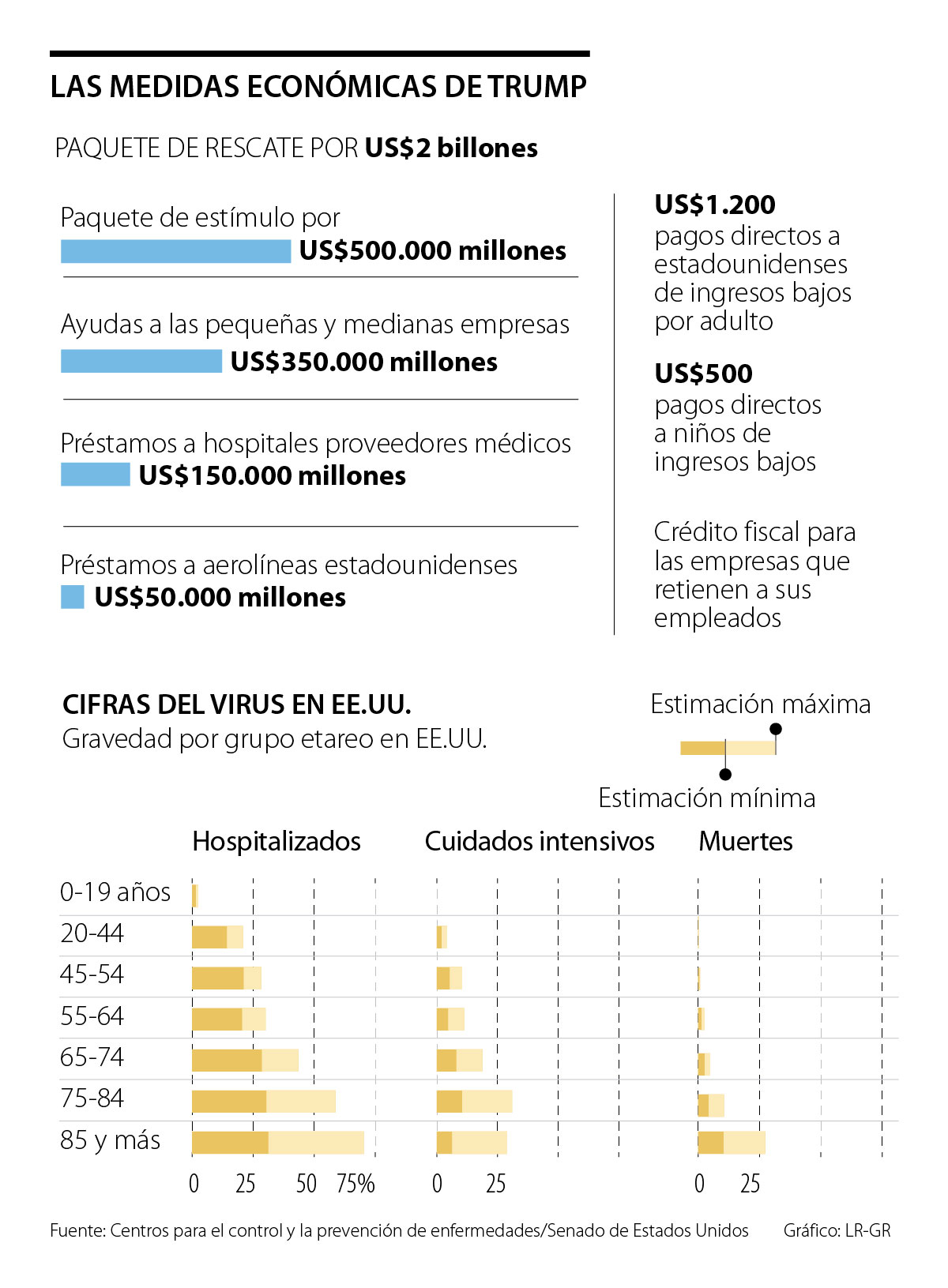 El paquete de rescate está calculado en US$2 billones y se compara con la ayuda financiera dada en la crisis de 2008, pero con mayor alcance debido a que es toda la población la que se vería afectada por la crisis pandémica.