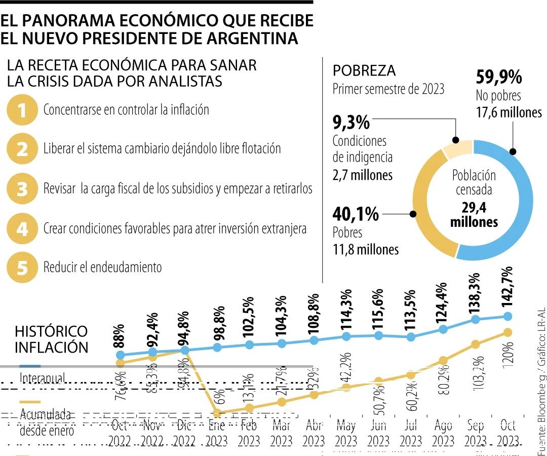 Argentina tiene actualmente una inflación que supera la tasa de 140%, la pobreza extrema llega a 40% de la población y la sequía ha hecho que 50% de los cultivos agrícolas del país presenten pérdidas. Además, lucha con una deuda fiscal y un déficit.