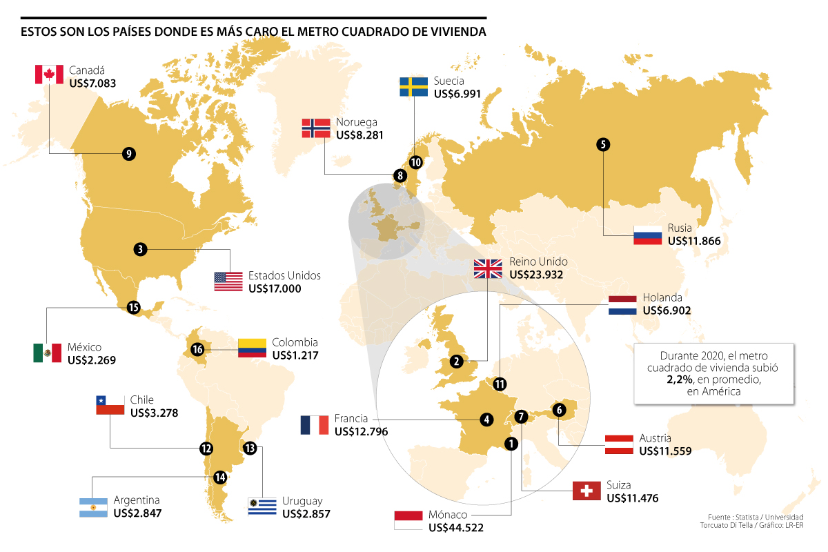 Encabezando el listado de los países con el precio promedio del metro cuadrado más alto en Europa y América está Mónaco, ya que allí este asciende hasta US$44.522 para una propiedad unifamiliar ubicada en el centro. Esto quiere decir que una casa de aproximadamente 120 metros cuadrados podría llegar a costar hasta US$5,3 millones, lo que representa un valor nueve veces mayor que el costo promedio de las viviendas en el continente europeo, según los datos del Centro de Investigación en Finanzas de la Universidad Torcuato Di Tella.