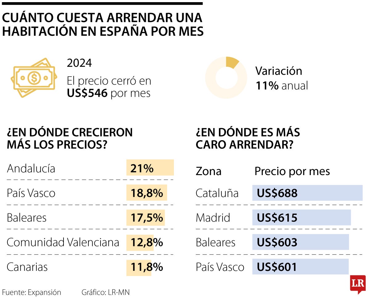 Así, arrendar una habitación en España a cierre 2024 costaba US$543 al mes, lo que supone un incremento anual de 11,7%, según el último informe presentado hoy por Fotocasa. Es decir, el precio medio de una habitación pasó de 466 euros/mes (US$487) en diciembre de 2023 a los 520 euros/mes (US$543) un año después.