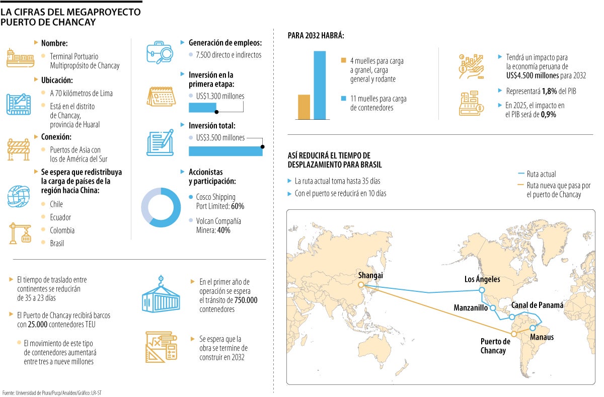 El megapuerto de Chancay está ubicado a 70 kilómetros de Lima, Perú, en la bahía de Chancay, provincia de Huaral. Promete ser el proyecto más importante de transporte marítimo para conectar los puertos de Asia con los de América del Sur, con lo cual beneficiará a países de la región, como es el caso de Colombia y Brasil, al recortar en 10 días el trayecto.