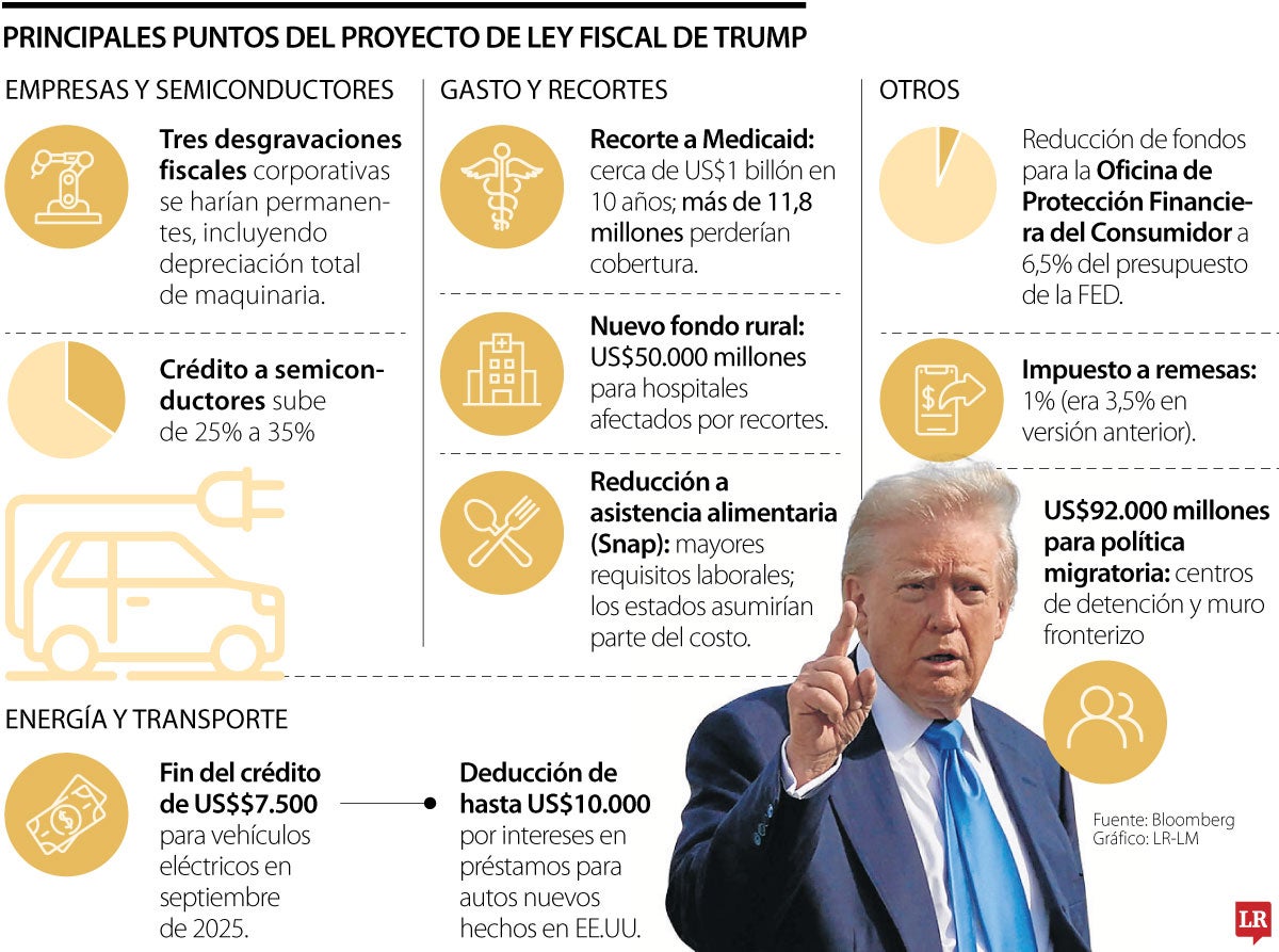 La emblemática legislación económica del presidente extendería los recortes de impuestos para empresas y particulares, aprobados inicialmente en 2017, que están a punto de expirar, e incorporaría nuevas exenciones temporales para los trabajadores con propinas y horas extra, las personas mayores y los compradores de automóviles que soliciten préstamos. Proporciona cientos de miles de millones de dólares en nuevos fondos para defensa y para la ofensiva migratoria de Trump.