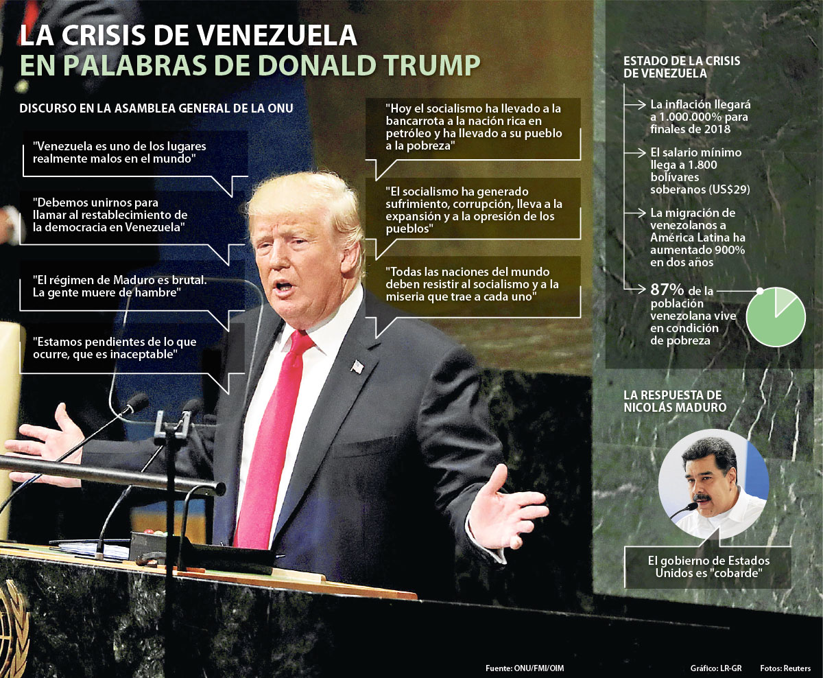 Uno de los discursos más esperados en la Asamblea General de la Organización de las Naciones Unidas (ONU) fue el del presidente de Estados Unidos, Donald Trump. Como era de esperarse, uno de los principales apuntados en el pronunciamiento del mandatario fue el régimen de Nicolás Maduro, pues aseguró que “es un lugar realmente malo”, y mencionó que el mundo “debe unirse para llamar al restablecimiento de la democracia en Venezuela”.