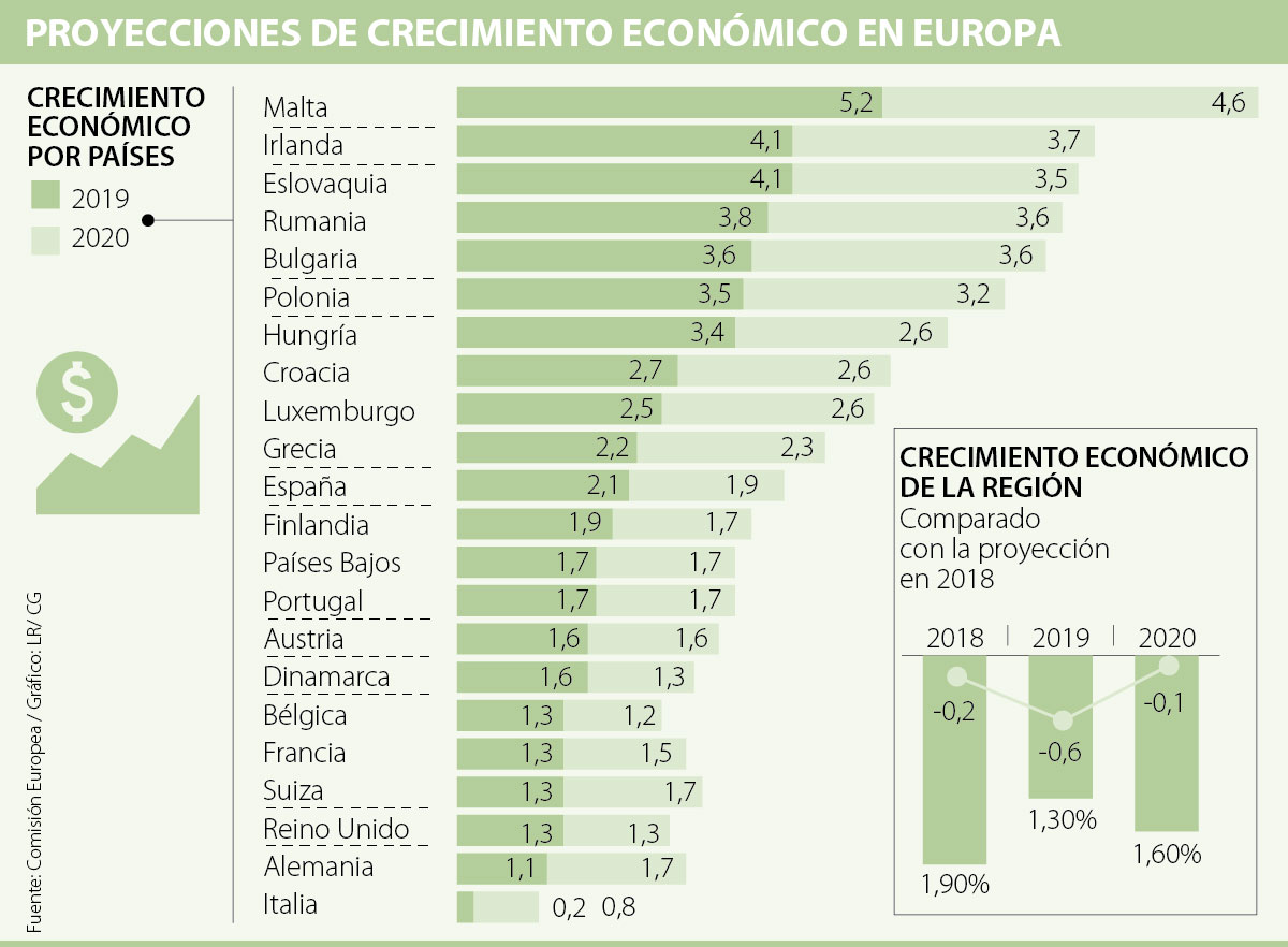 Las economías más grandes de la Zona Euro serán las más afectadas. Según la Comisión Europea, el PIB de la zona del euro crecerá 1,3% en 2019 y un 1,6% en 2020, estas cifras son 0,6 puntos y 0,2 puntos más bajas a ese 1,9% y 1,8% pronosticado en otoño de 2018.