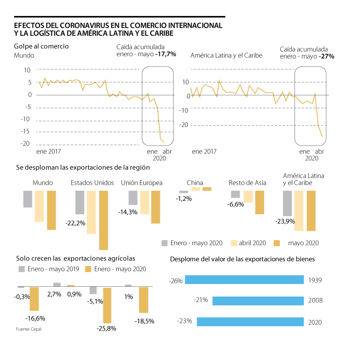 La economía mundial sigue sintiendo el impacto del covid-19, y sus efectos se comienzan a ver en las expectativas para cierre del año. La Comisión Económica para América Latina y el Caribe, Cepal, mostró en su reciente estudio sobre los efectos del covid en el comercio internacional y la logística de América Latina y el Caribe, que el valor de las exportaciones caería 23%, “el peor desempeño en casi 80 años”, expresó Alicia Bárcena, secretaria ejecutiva.