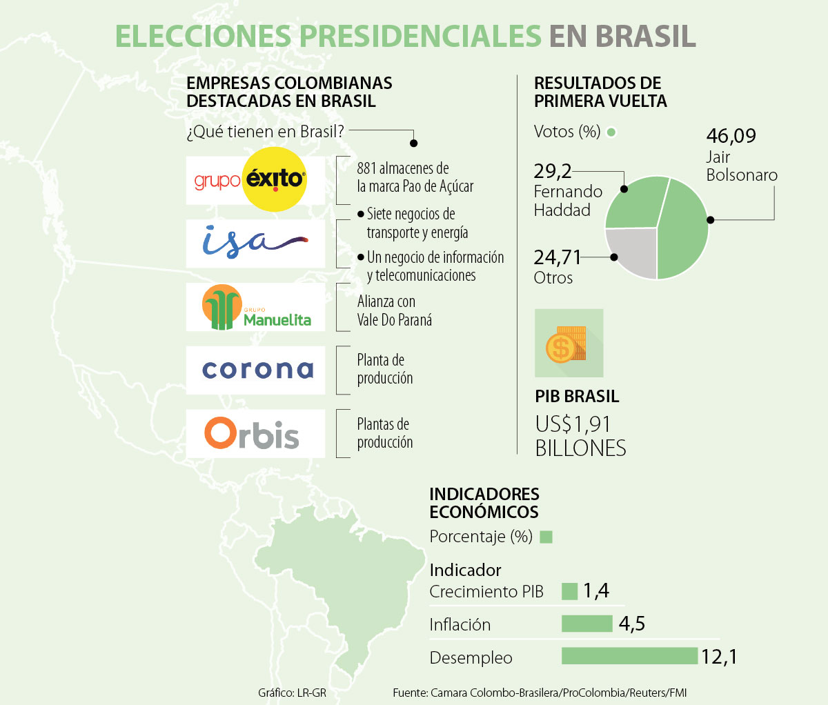 El futuro de la economía más grande de América Latina se decide mañana en medio de un panorama electoral con dos enfoques distantes. Está en las manos del ultraderechista Jair Bolsonaro o del izquierdista Fernando Haddad levantar un país que ha enfrentado serios problemas para recuperar su rumbo, debido a una crisis económica que aún no se ha solucionado del todo y que aún reviste incógnitas sobre cómo afectará a las empresas colombianas allí presentes, como Éxito e ISA.