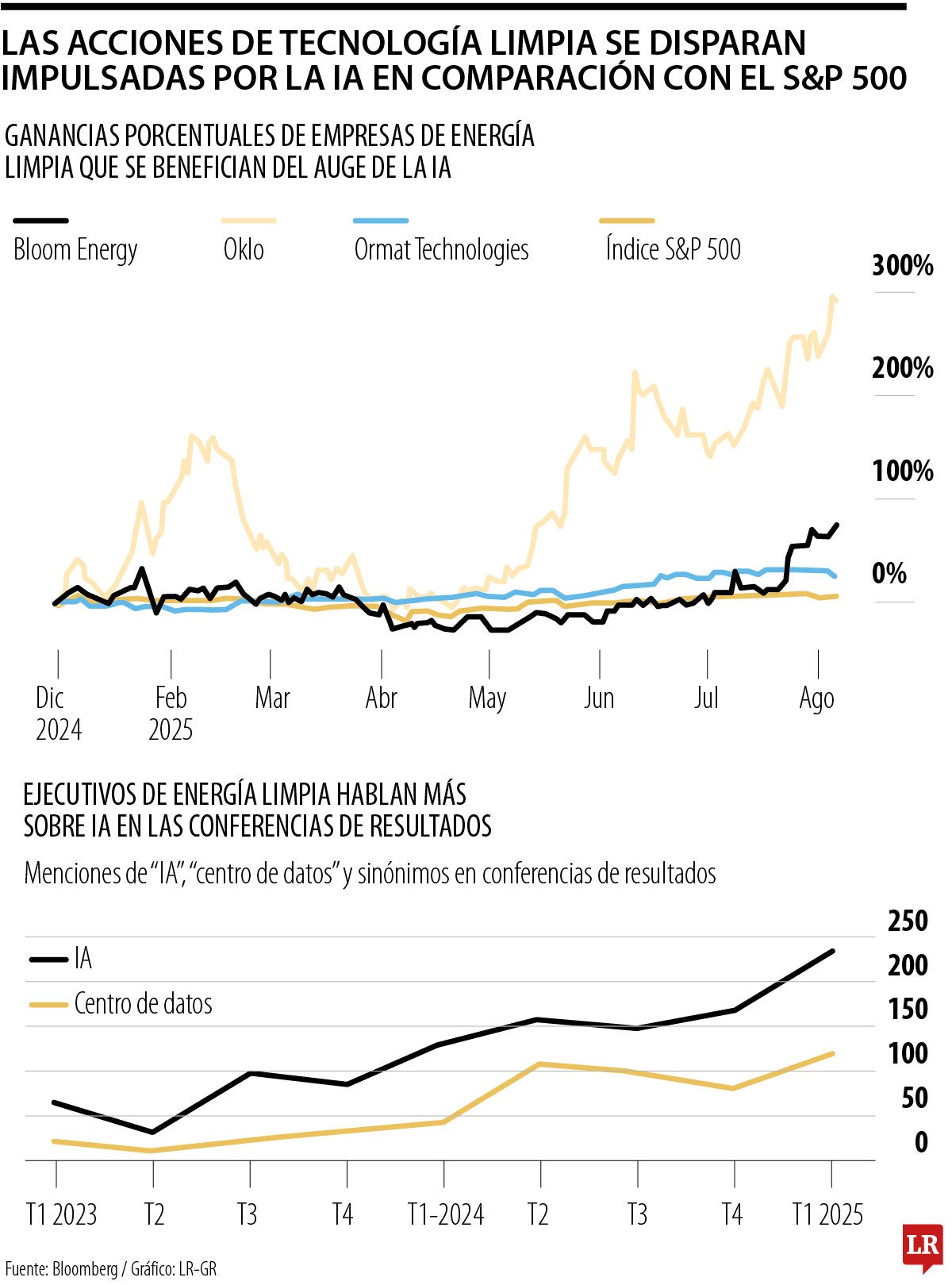 Las empresas de tecnología limpia que han firmado acuerdos para respaldar centros de datos han visto sus acciones dispararse este año, superando al S&P 500. Las acciones de la startup de energía nuclear Oklo han subido casi un 275 % en lo que va de año, mientras que el precio de las acciones del proveedor de pilas de combustible Bloom Energy ha subido 66%. El almacenamiento de energía y la energía limpia atrajeron la mayor inversión pública y privada entre los sectores de tecnología climática el trimestre pasado, según información de Bloomberg.