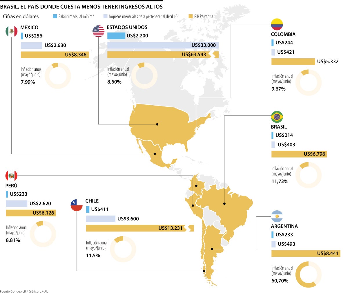 Como polo opuesto aparecen países como Brasil y Perú, en donde la cifra necesaria para estar entre los más ricos se reduce a ingresos mensuales sobre los US$403 y US$2.620 respectivamente. Esto, cuando se tiene en cuenta que el salario mínimo mensual en ambos países roza los US$214 y US$233.