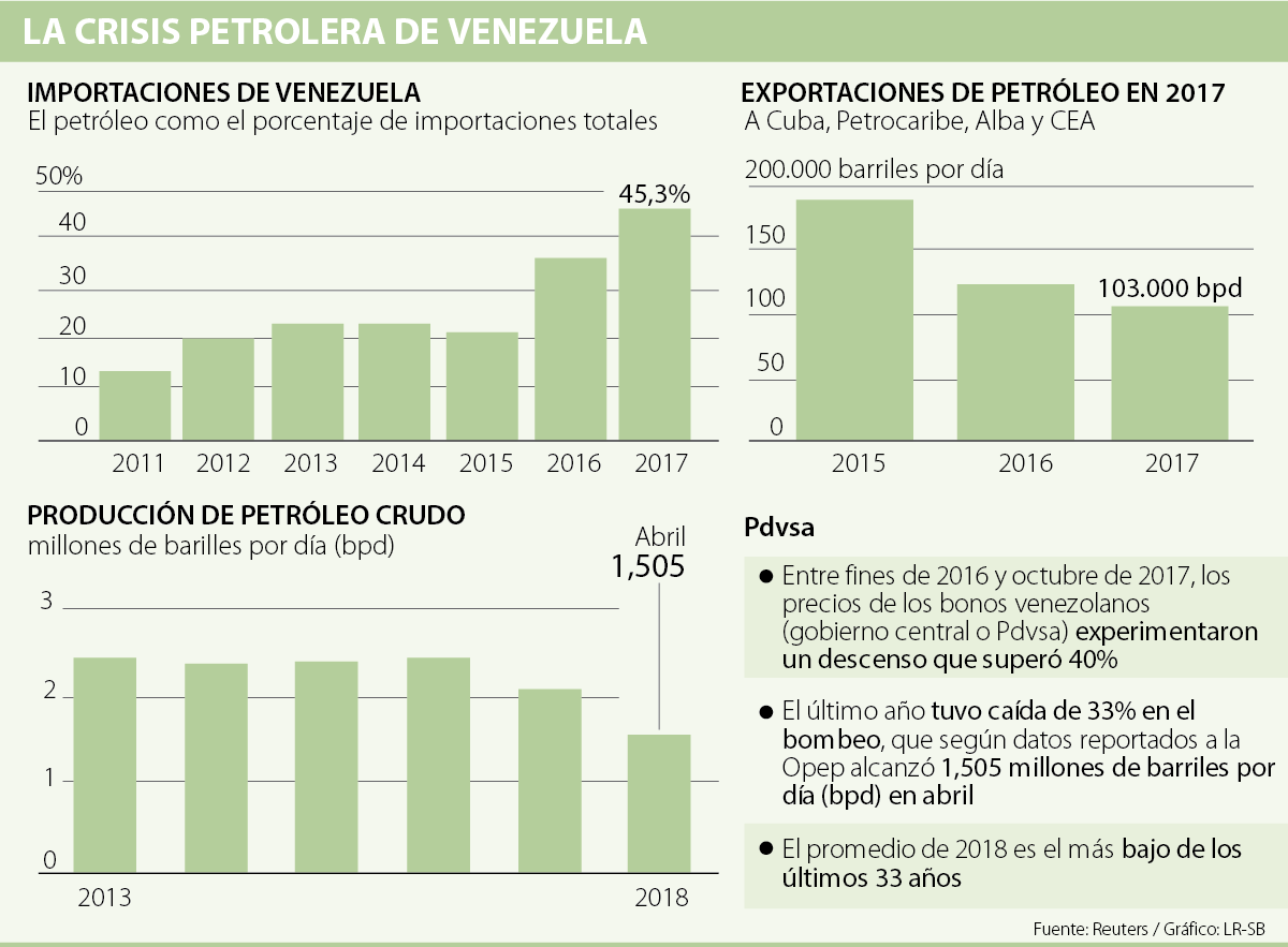 Venezuela llega a las elecciones presidenciales en medio de la peor crisis petrolera de su historia, paradójicamente cuando los precios internacionales del crudo están en máximos de cuatro años. Los comicios, que seguramente ganará el presidente Nicolás Maduro, se harán en medio de una coyuntura en la que la producción petrolera del país ha caído 45% en los últimos cinco años.