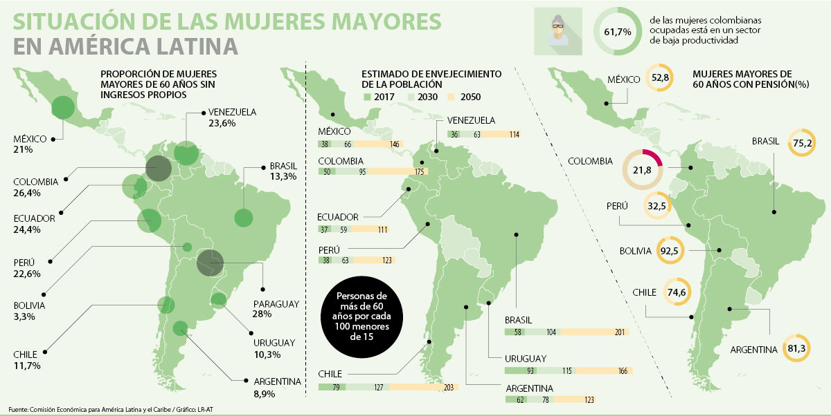El informe además señala que en la región el crecimiento de la población adulta va en alza. Según sus estimaciones, Chile, Brasil y Colombia tendrán, en ese orden, las poblaciones con mayor número de personas mayores de 60 años por cada 100 personas menores de 15 para 2050. En ese caso, Chile tendría 203 sexagenarios o mayores por cada 100 niños y adolescentes menores de 15 años, mientras Brasil, 201. Colombia les sigue con 175, sin embargo, ninguno de los dos países antes mencionados tiene una tasa de mujeres mayores sin ingresos tan alta.