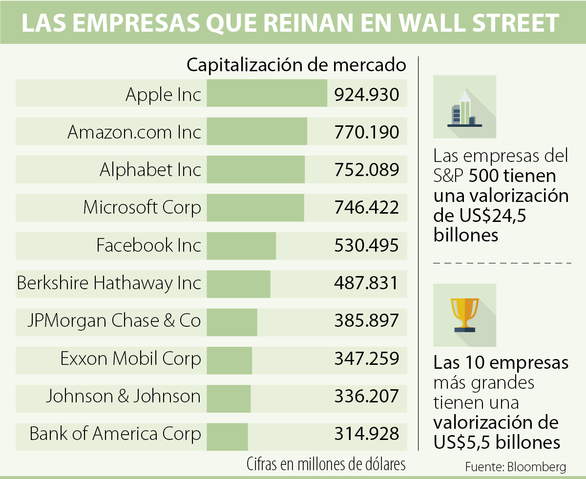 El top cinco lo completan Microsoft (US$746.442 millones) y Facebook (US$530.495 millones). De ahí en adelante salen compañías de otros sectores como Berkshire Hathaway (US$487.831 millones), JPMorgan Chase (US$385.897 millones), Exxon Mobil (US$347.259), Johnson & Johnson (US$336.207 millones) y Bank of America Corp (US$314.928 millones).