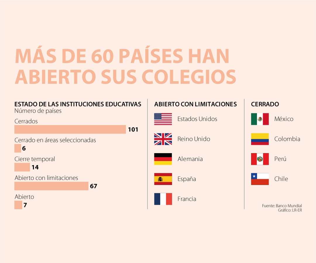 Según datos del Banco Mundial, 67 países, ubicados en su mayoría en Europa y Asia Central, han reabierto sus puertas o se están preparando para hacerlo. Para junio, tal y como lo indica la encuesta de esta entidad internacional junto a la Unesco y Unicef, 95% de los países encuestados planeaba la reapertura de los colegios, pero también tomar medidas para evitar los contagios.