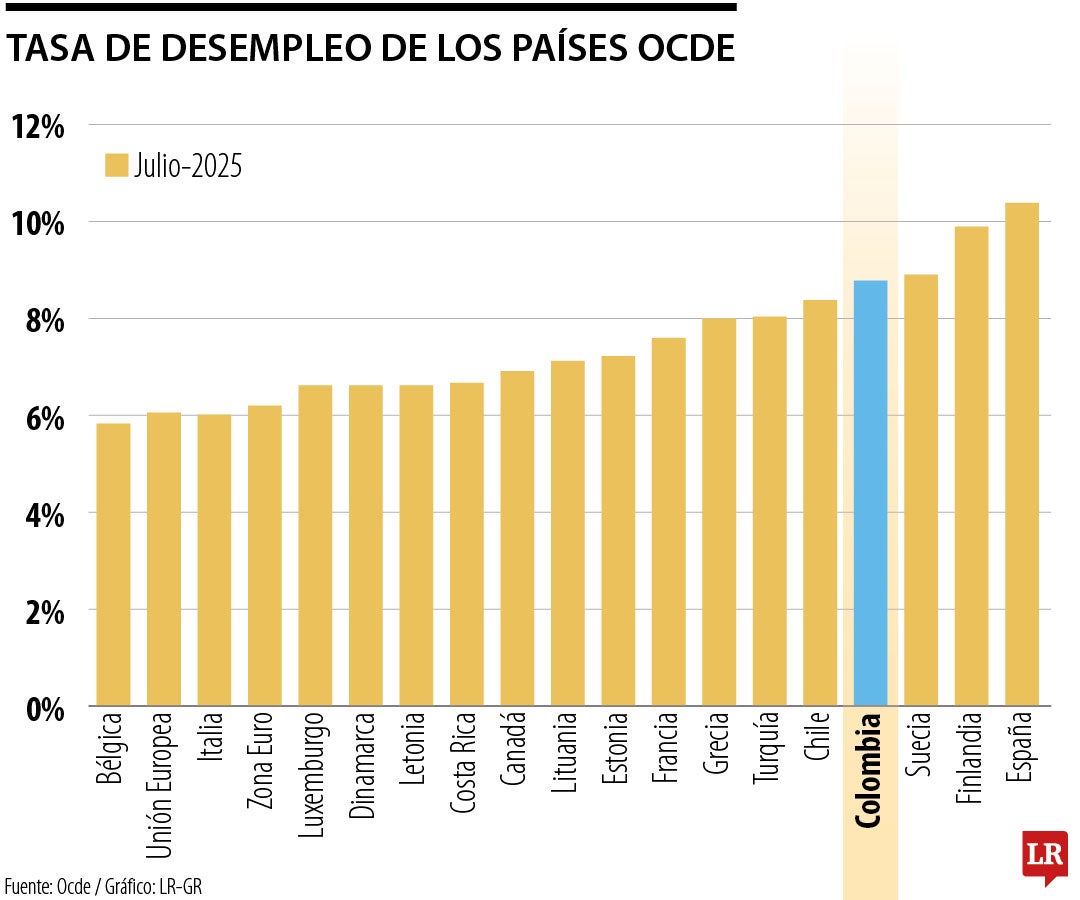 A pesar de un resultado estable en el panorama general, en julio de 2025, la tasa de desempleo en los países de la Ocde mostró contrastes significativos. Mientras naciones como Japón, México y Corea registraron los niveles más bajos, inferiores a 3%, otros países enfrentaron cifras mucho más elevadas. En el extremo superior se encuentran España, Finlandia, Suecia y Colombia, que superaron una tasa de desempleo de 8%, siendo España la que lidera con cerca de 11%. Estos países se consolidan como los miembros con mayores dificultades en su mercado laboral.