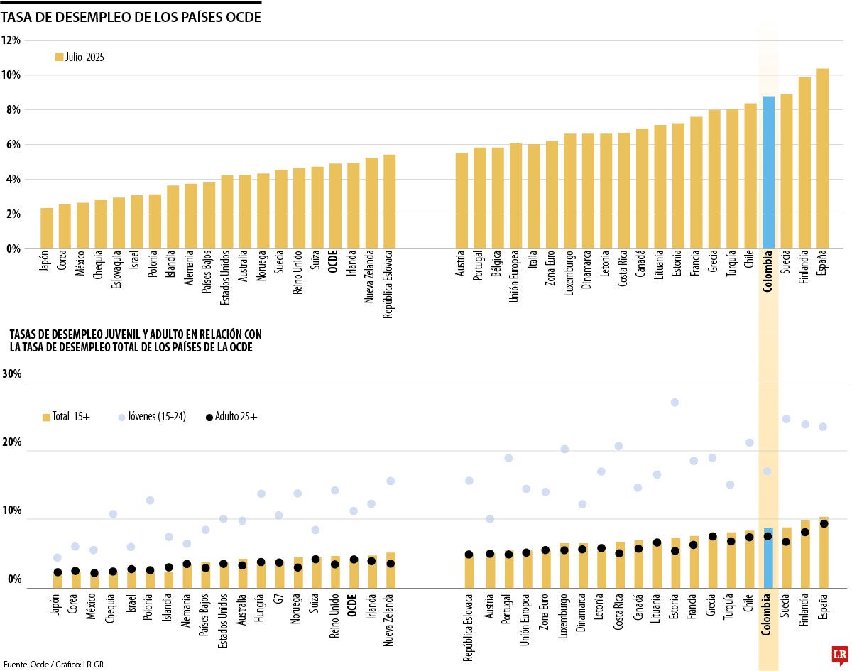 Cuervo agregó que “otro factor es que no supimos aprovechar el “efecto rebote” que generó la apertura post covid-19. Otros países de la Ocde si lo hicieron; ante el rebote de reactivación económica generaron más y mejor empleo”. Por otro lado, Grecia, Italia y Francia, por ejemplo, mantienen tasas entre 7% y 9%, muy por encima del promedio de la Ocde. En el caso de Colombia, la tasa se mantiene por encima de 8,5%, lo que refleja los retos estructurales en su mercado laboral, como la alta informalidad, la lenta absorción de mano de obra y la dificultad de generar empleo estable en medio de la coyuntura económica.