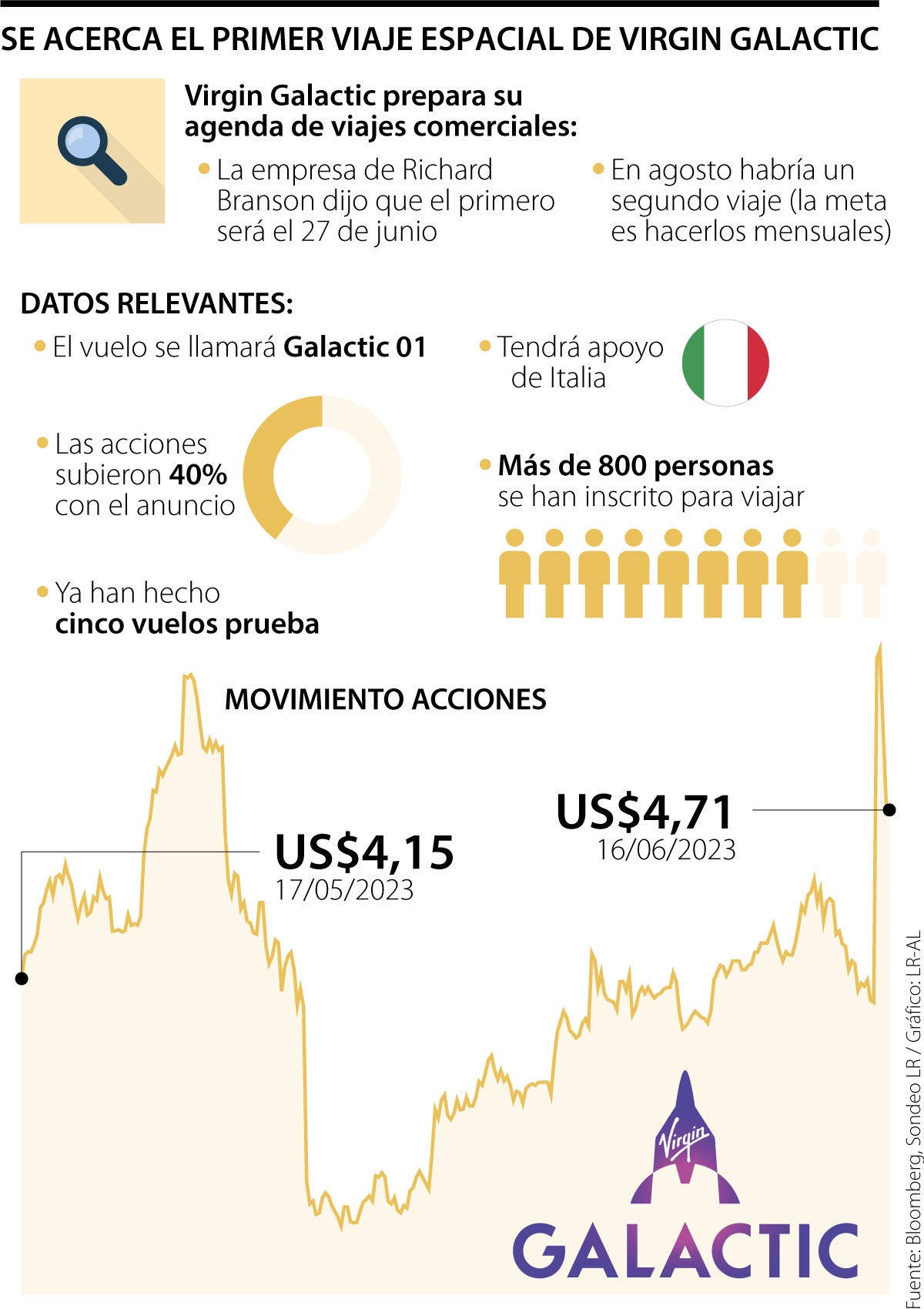 Las acciones de Virgin Galactic subieron 40% a US$5,68 a las 7:37 a. m. en las primeras operaciones de Nueva York y a las 9:30 a.m. alcanzó máximos de US$5,93. La tendencia en la sesión regular fue de US$5,06, encaminada a ser la más alta en dos años.