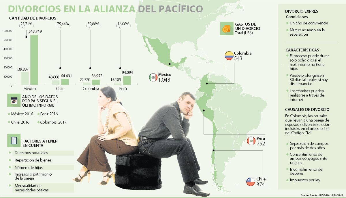 Por su parte, México es el país con los costos más elevados en materia de divorcios, pues arroja un total de US$1.048, mientras que en Perú las separaciones de mutuo acuerdo llegan hasta US$752.