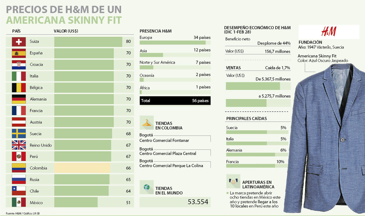 La cadena sueca de ropa H&M tiene 53.554 tiendas alrededor de 56 países. En América Latina, su expansión se ha centrado en los cuatro países de la Alianza del Pacífico, por lo que LR hizo un sondeo entre los cuatro países de este grupo económico además de 11 naciones de Europa, en donde se encuentran las que más le generaron ventas en el primer trimestre.
