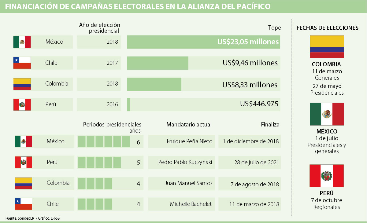 México es el país de la Alianza del Pacífico que permite la financiación más alta para las campañas electorales, mientras que Perú tiene el tope más bajo, en medio de un año que estará marcado por las elecciones que habrá en América Latina.