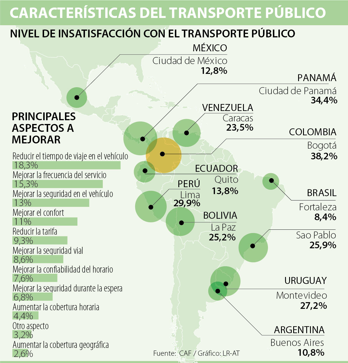 La CAF también averiguó cuáles son los aspectos que deben mejorar estas urbes frente al problema de transporte y los encuestados respondieron que la prelación debe ser reducir el tiempo de viaje en el vehículo (18,3%). También dijeron que se debe mejorar la frecuencia del servicio (15,3%) y mejorar la seguridad (13%). La ampliación en la cobertura horaria (4,4%), o la geográfica (2,6%) son identificados como una prioridad menor que las anteriores.