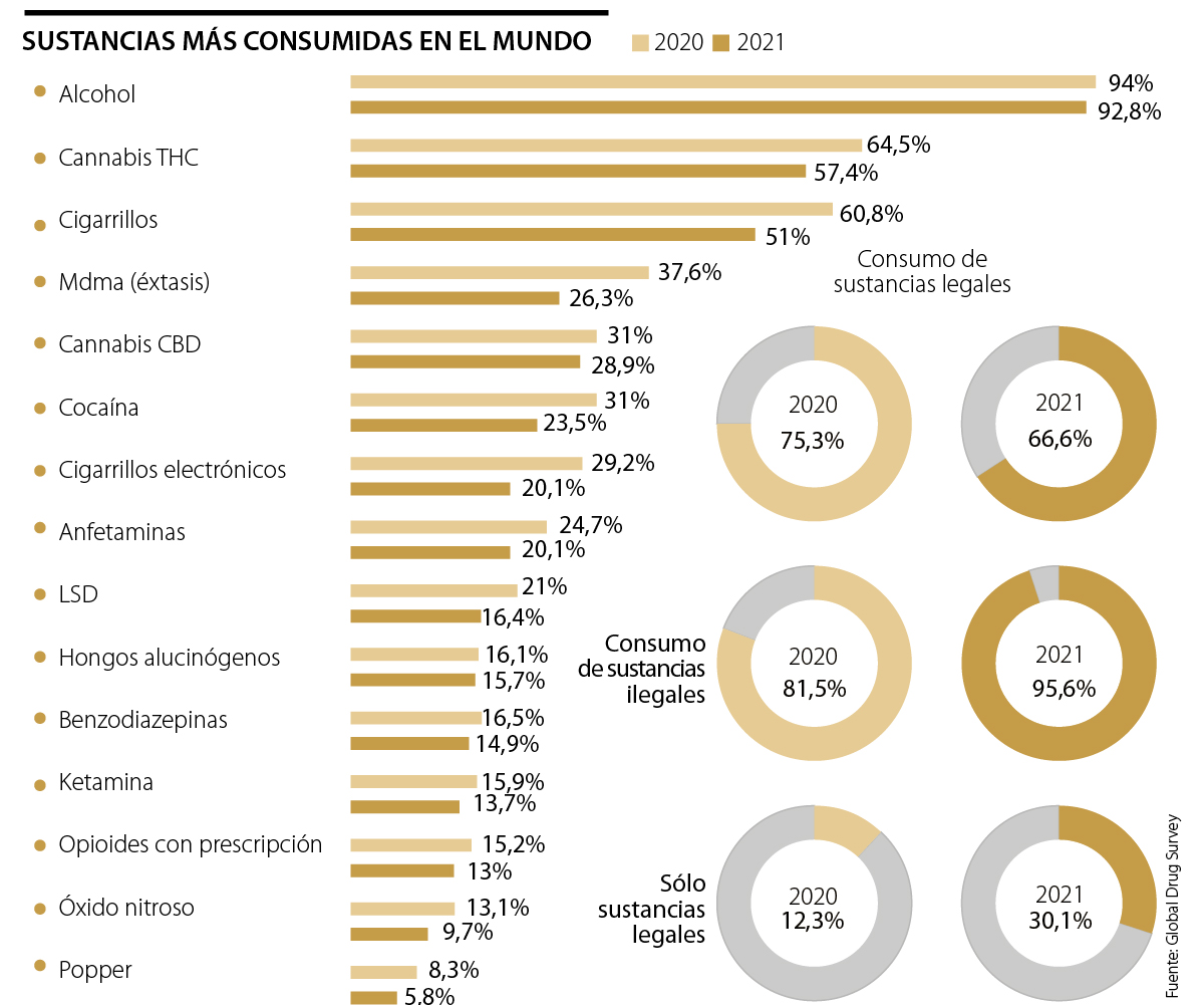 De acuerdo con una reciente encuesta mundial realizada por la empresa de investigación londinense Global Drug Survey (GDS), el alcohol, el cannabis y el cigarrillo fueron las sustancias adictivas más consumidas durante 2021.