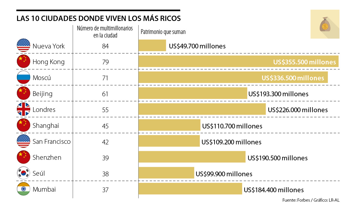 Esas 10 ciudades son: Nueva York, donde residen 84 de los multimillonarios destacados por Forbes, quienes suman una riqueza de US$49.700 millones; Hong Kong (con 79 millonarios y un patrimonio total de US$355.500 millones); Moscú (71 ricos y US$336.500 millones), Beijing (61 personajes y US$193.300 millones), Londres (55 magnates y US$226.000 millones).