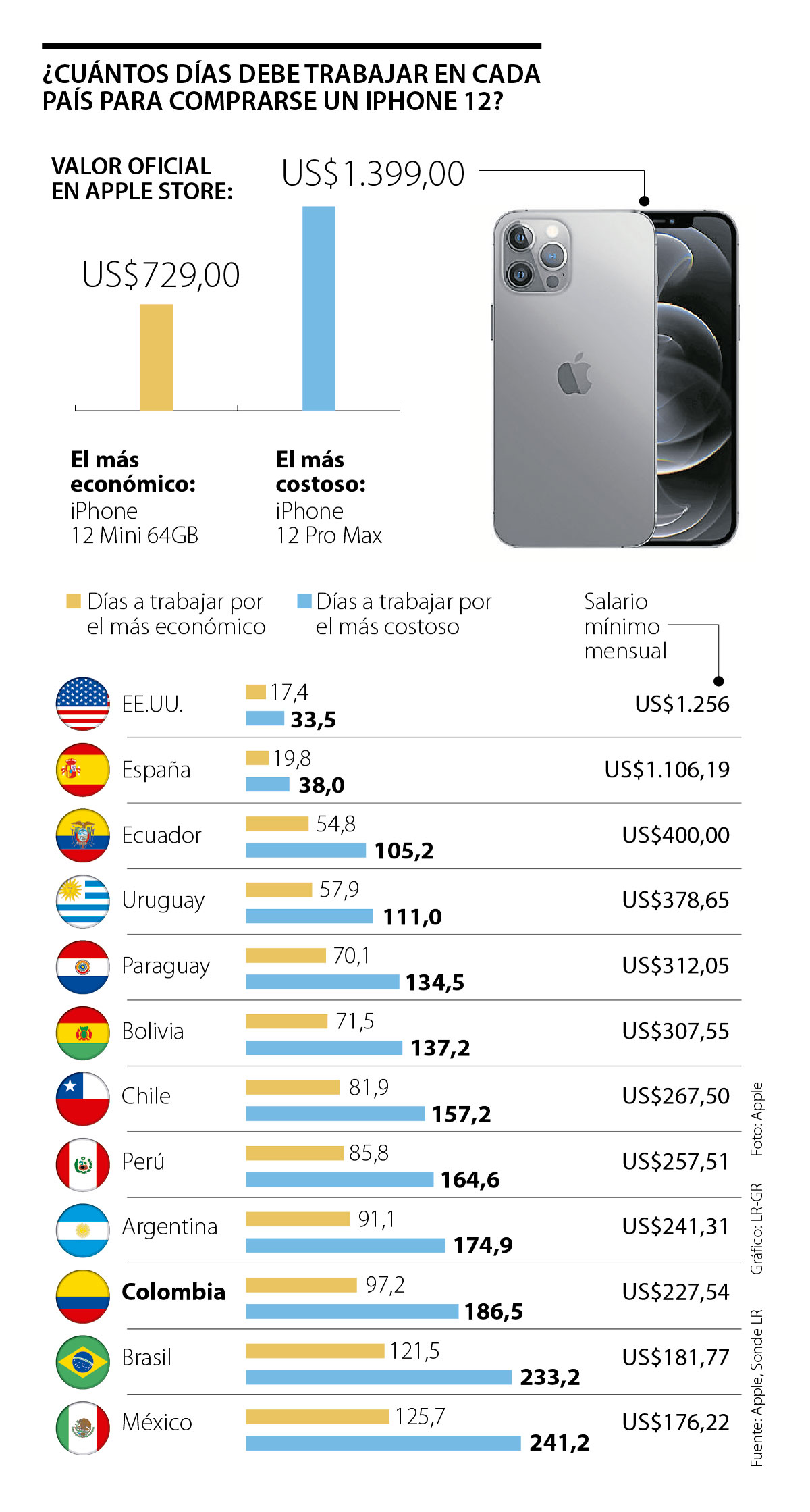 LR realizó un sondeo en el que estimó cuántos días tendría que trabajar una persona que gana el mínimo en 12 países diferentes para tener este equipo. En Colombia, con un salario mínimo de unos US$227,54, habría que trabajar 97,2 días por el modelo más económico, el iPhone 12 Mini de 64 GB y 186,5 días por el iPhone 12 Pro Max.